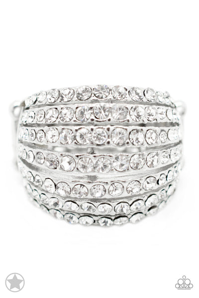 Row after row of incandescent white rhinestones stack into a dazzling display. The gorgeous rounded bands and undeniable sparkle create a regal statement piece. Features a stretchy band for a flexible fit.