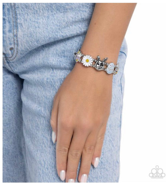 Infused along elastic stretchy bands, a collection of Easter-inspired charms including various multicolored Easter eggs with multicolored rhinestones, silver bees, bunny heads, and daisies encircles the wrist separated by stacked silver beads for an eclectic pop of eye-catching whimsy and color.