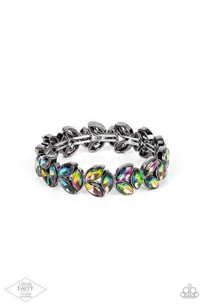 Featuring a stellar oil spill finish, trios of marquise cut rhinestones delicately join into leafy gunmetal frames along a stretchy band, creating a refined display around the wrist.