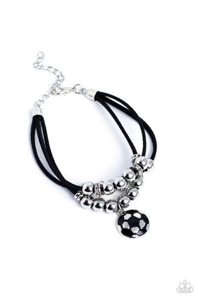 Featuring a black soccer ball pendant with silver pentagon accents, shiny silver beads are threaded along row after row of black cording around the wrist for a sporty look. Features an adjustable sliding knot closure.