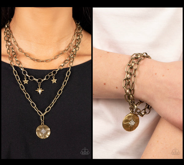 Three gritty brass chains layer down the chest. Flanked by a pair of hammered brass stars, a white rhinestone dotted star swings from the centermost chain above a hammered brass frame twinkling with a white rhinestone dotted star design for a stellar finish. Features an adjustable clasp closure.