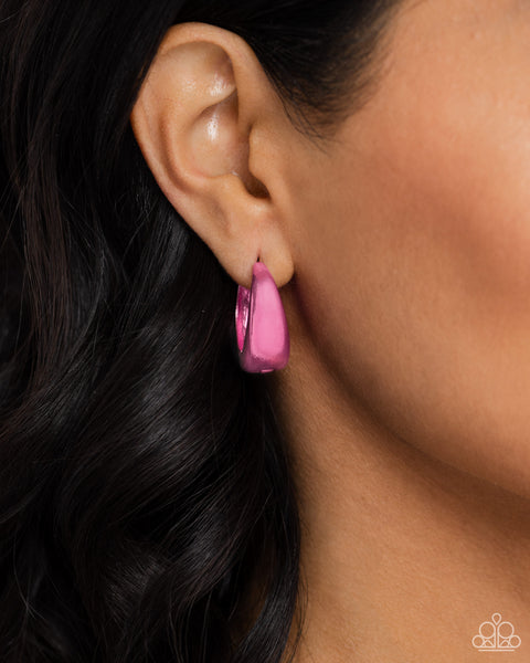 Dipped in an electric pink hue, a thick hinge hoop curls around the ear for a splash of bright color. Earring attaches to a standard hinge closure fitting. Hoop measures approximately 3/4" in diameter.
