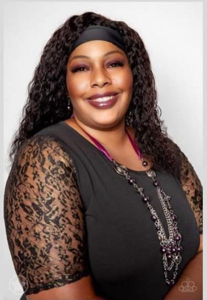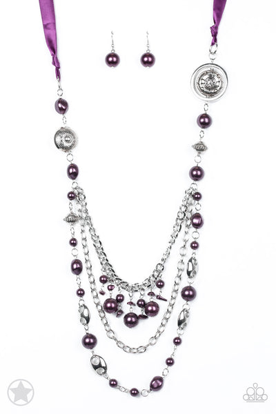 A silky purple ribbon replaces a traditional chain to create a timeless look. Pearly deep purple beads and funky silver pieces intermix with varying lengths of silver chains to give a fresh take on a Victorian-inspired piece.