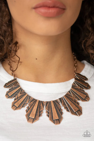 Stacked in edgy geometric textures, glistening copper plates gradually increase in size as they connect below the collar, creating a fierce fringe. Features an adjustable clasp closure.