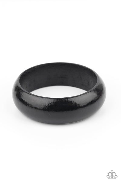 Brushed in a neutral black finish, an oversized wooden bangle makes a boldly authentic impact.