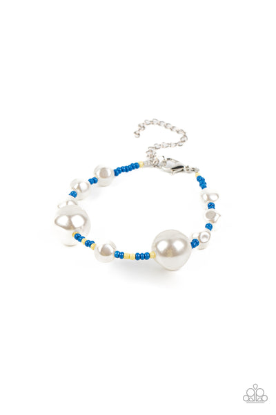 Irregular-shaped pearls in varying sizes are scattered amongst blue and yellow seed beads that are threaded along a wire, resulting in a refreshing and playful style around the wrist. Features an adjustable clasp closure.