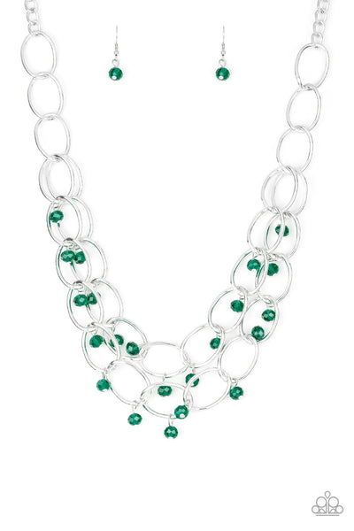 Green crystal-like beads swing from two layers of oversized silver links below the collar for a refined look. Features an adjustable clasp closure.