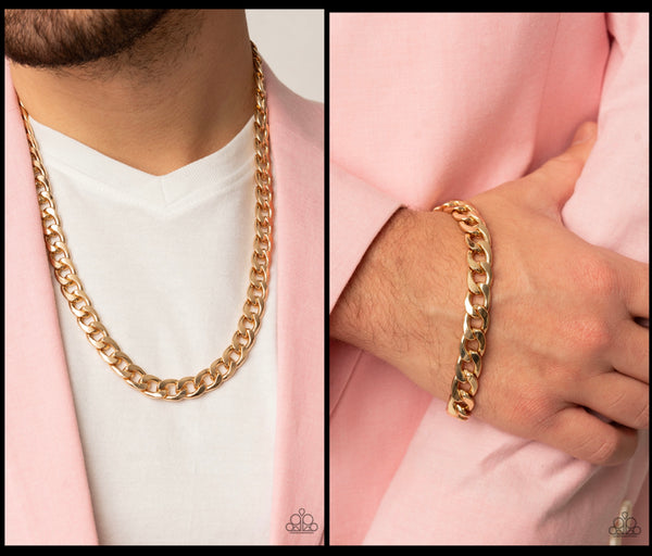 A thick gold strand of curb chain drapes around the wrist for a bold industrial look. Features an adjustable clasp closure.