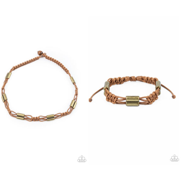 Bold brass accents are knotted in place along tan cording that decoratively braids around the wrist for a rustic flair. Features an adjustable sliding knot closure.