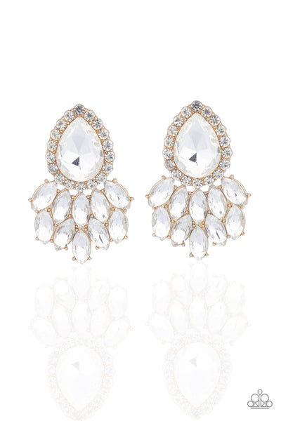 Glassy white marquise style rhinestones cascade from the bottom of a dramatically oversized white teardrop gem, coalescing into a regal frame. Earring attaches to a standard post fitting.