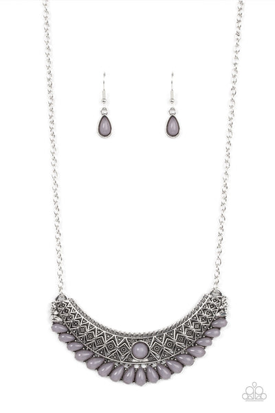 A fan of Ultimate Gray teardrop beads flares out from the bottom of a silver half moon frame that is radiating with dainty studs and geometric texture, resulting in a dramatic pendant below the collar. The center of the tribal-inspired frame is dotted with a matching Ultimate Gray bead, finishing the trailblazing motif with a final pop of color. Features an adjustable clasp closure.
