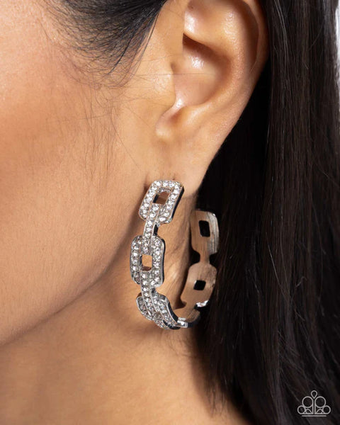 Dusted in glistening white rhinestones, grungy silver curb chain links are connected by silver rhinestone-embellished links, curling below the ear for an elegantly edgy look. Earring attaches to a standard post fitting. Hoop measures approximately 2" in diameter.