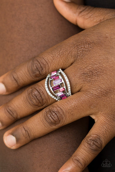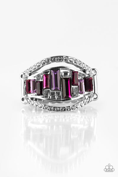 White rhinestone encrusted bands flank a row of emerald cut glass beads in shades of purple for a regal look. Features a stretchy band for a flexible fit.